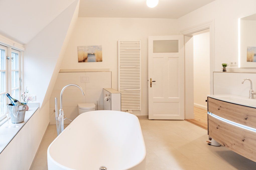 The house has a total of three fully equipped bathrooms. Two of them are on the upper floor. In the "large bathroom" a free-standing bathtub and a spacious rainforest shower invite you to relax and feel good. The two "small bathrooms", one on the upper floor and one on the ground floor, have a shower, toilet and sink.
